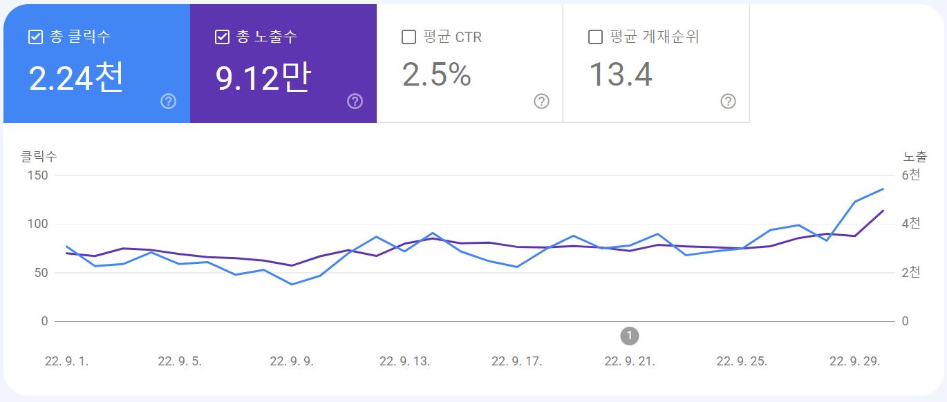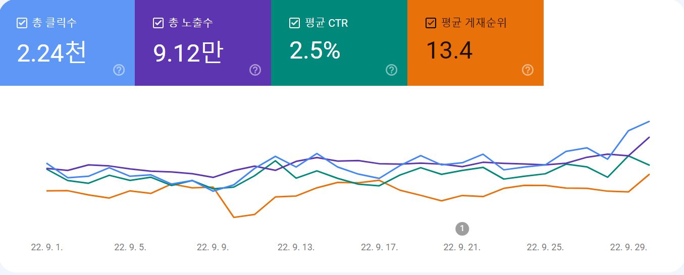 08월과 비교하면 총 클릭수 및 총 노출수는 감소되었습니다.