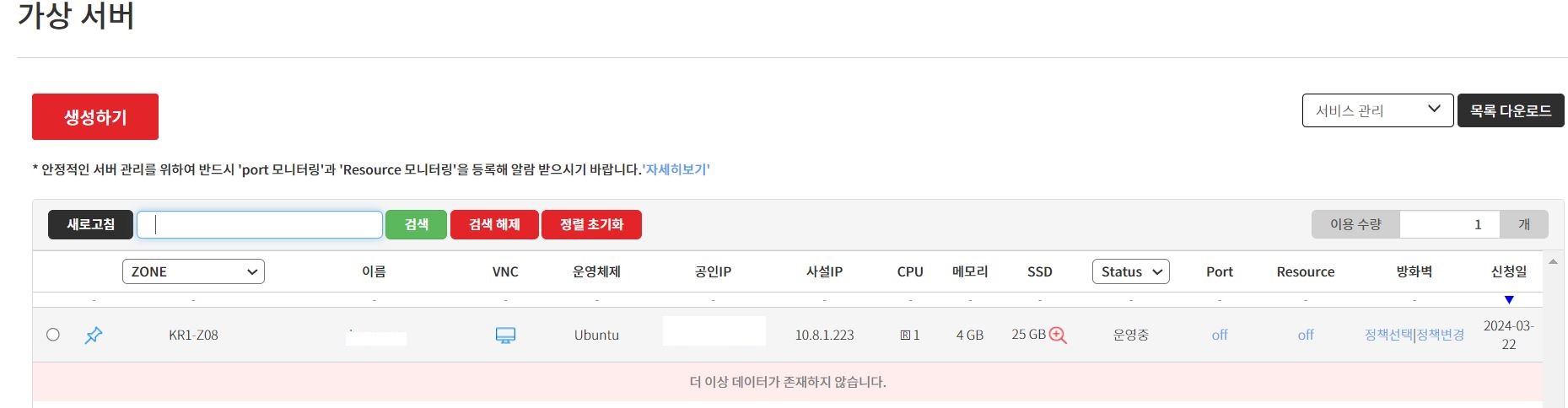 신청 가능한 서버는 KR1-Z08, KR1-Lite-Z03