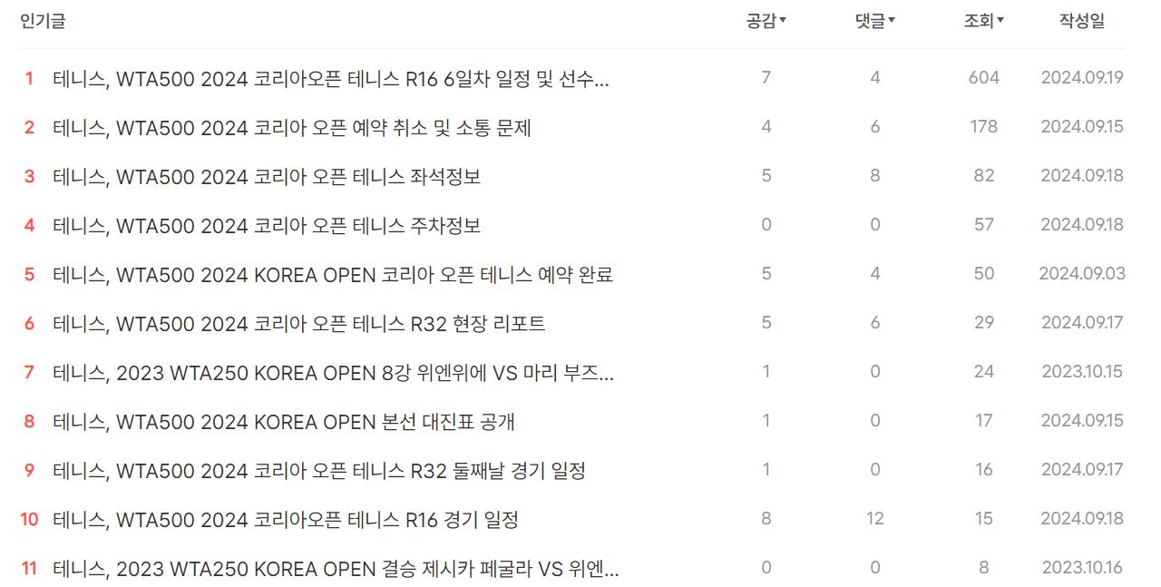 바로 2024 코리아오픈 테니스 대회 관련글이 주요했습니다.