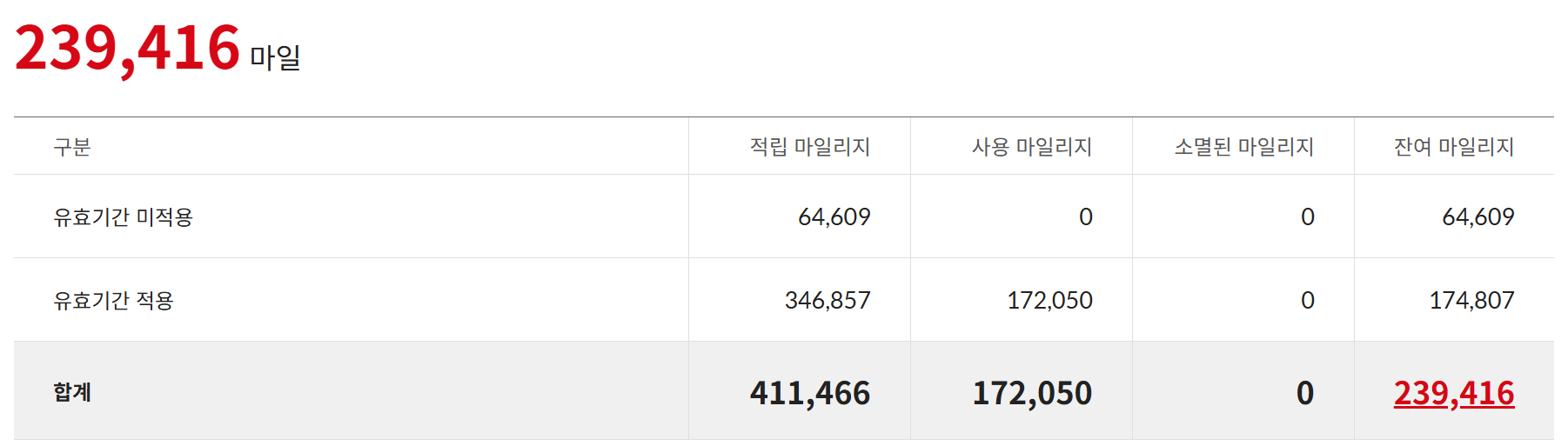 마일리지를 조회하니 239,416 마일이 있습니다.