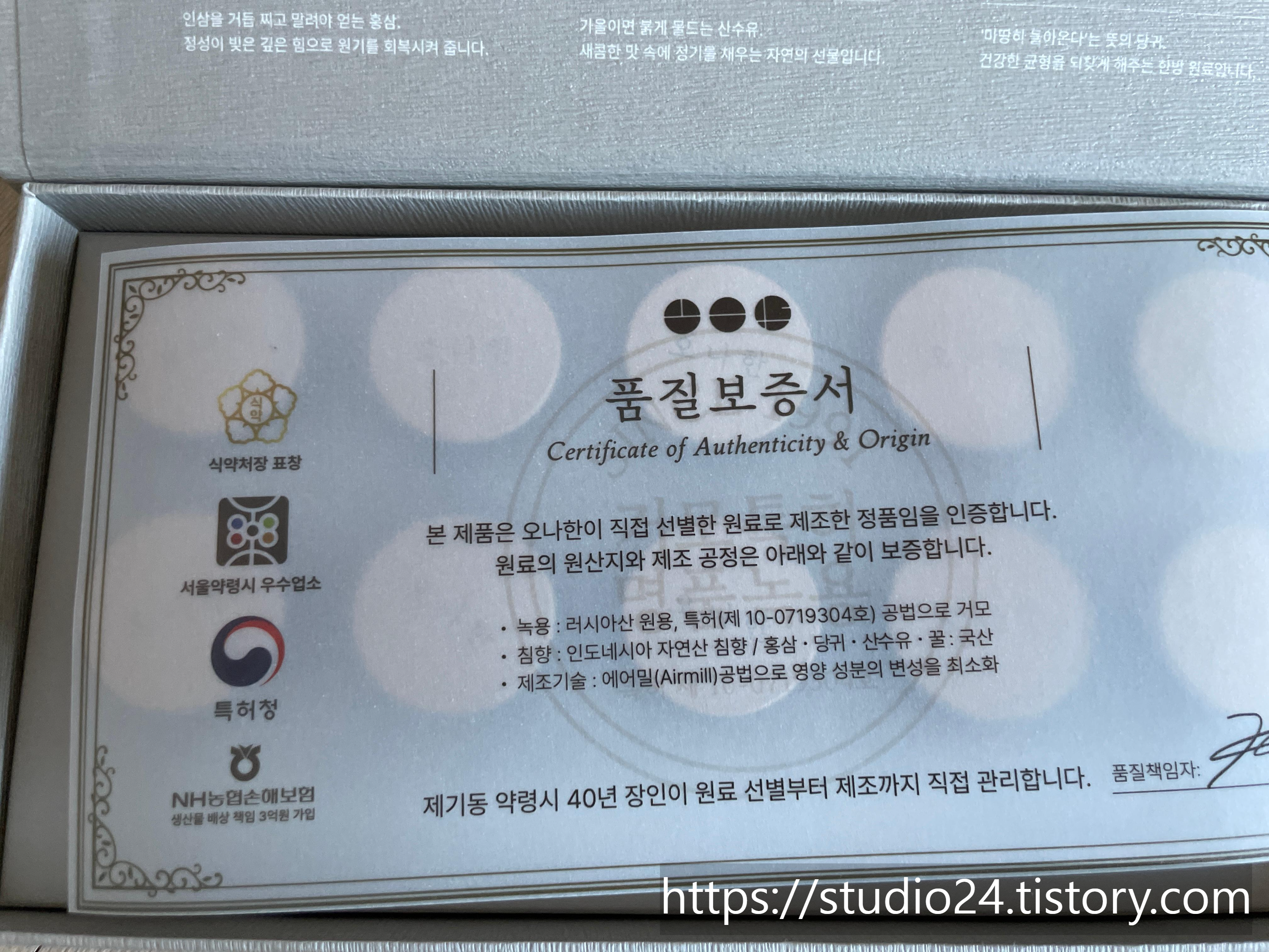 품질보증서도 있고, 직접 선별한 재료, 그리고 녹용은 특허받은 공법으로 가공한다고 합니다.