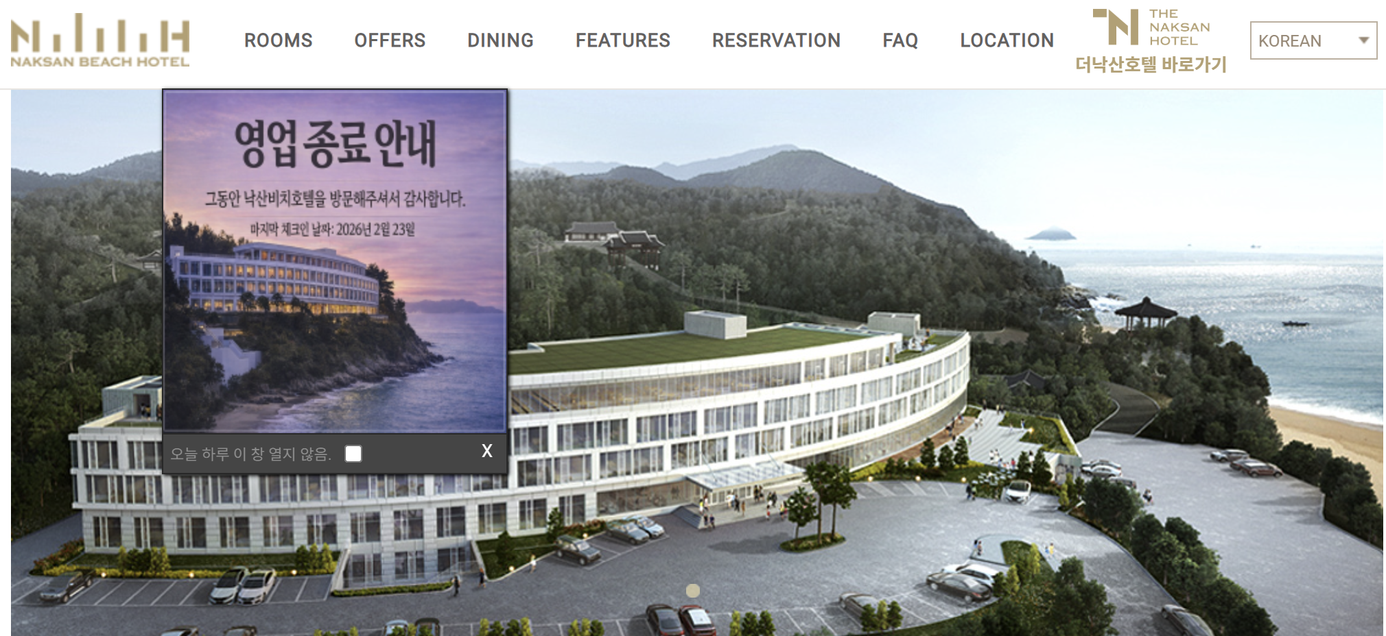 낙산비치호텔 공식 채널과 예약 사이트에서 2026년 2월 24일 체크아웃까지 운영 후 영업 종료를 명확히 안내하고 있습니다.