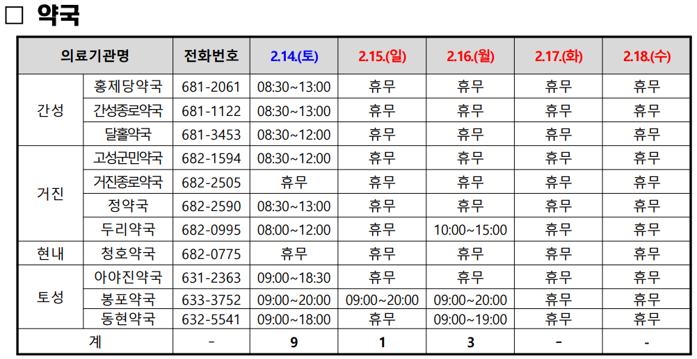 - 봉포약국 (633-3752): 2월 14~16일 09:00 ~ 20:00 (연속 운영).
